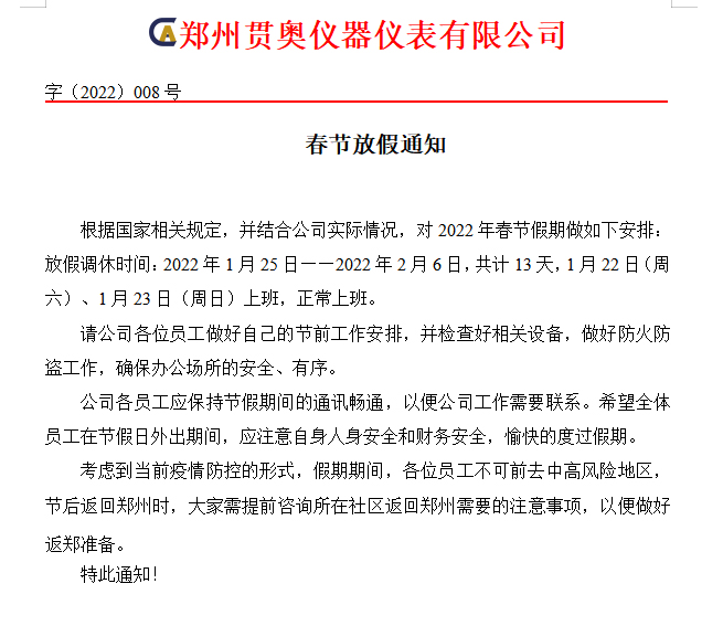 在此,感謝大家在過(guò)去一年里對(duì)鄭州貫奧儀器儀表的支持與信任。同時(shí)也希望在新的一年里,鄭州貫奧儀器儀表能繼續(xù)得到大家的關(guān)注及支持,并且鄭州貫奧儀器儀表也會(huì)一如既往地為大家提供更優(yōu)質(zhì)的服務(wù)!
