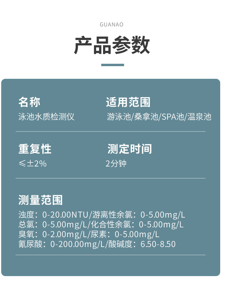 4、檢測(cè)精準(zhǔn),項(xiàng)目齊全。貫奧泳池水質(zhì)監(jiān)測(cè)儀器設(shè)備可檢測(cè)12個(gè)常規(guī)項(xiàng)目,參數(shù)可自由定制。