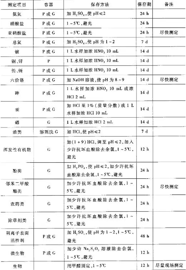 水樣的保存期與多種因素有關(guān),如組分的穩(wěn)定性、濃度、水樣的污染程度等。表2-2列出了部分測(cè)定項(xiàng)目水樣的保存方法和保存期。