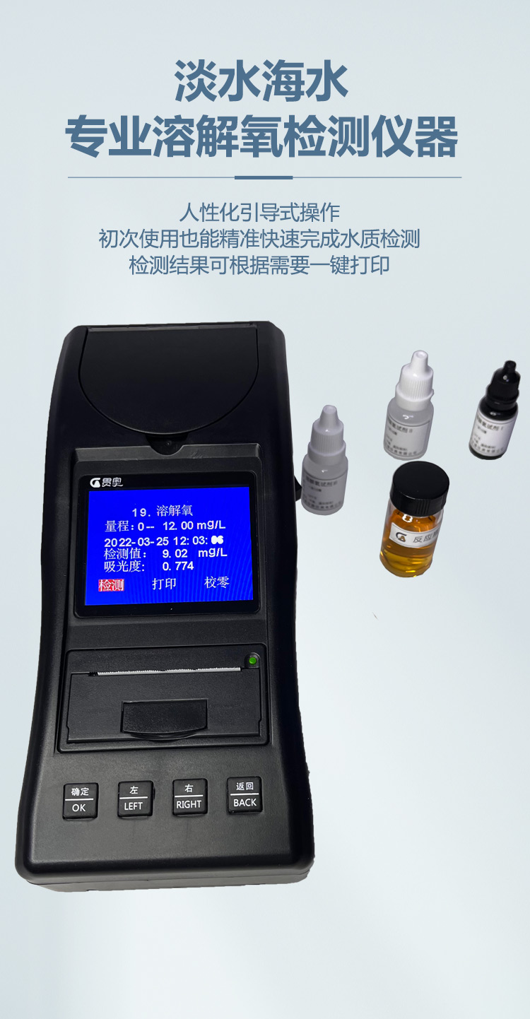 3、溶解氧測試儀采用分光光度的光電比色原理,操作簡便,取水樣放入試劑反應(yīng)幾分鐘即可讀數(shù),重復(fù)性≤±2%。