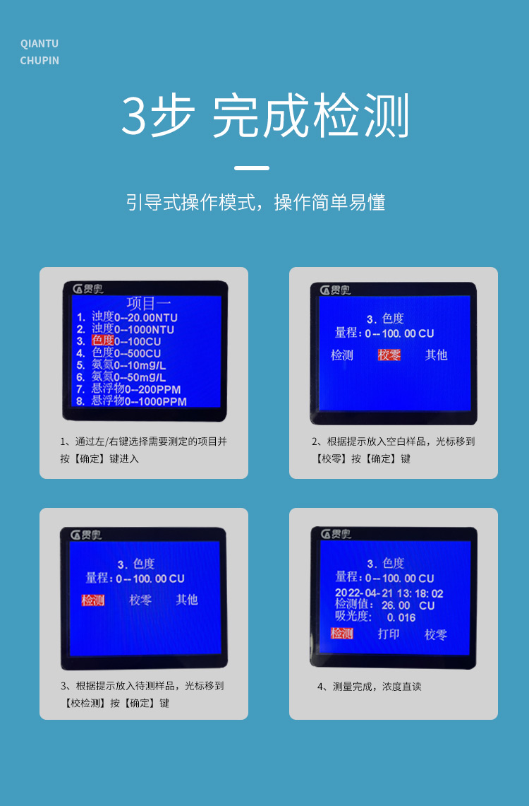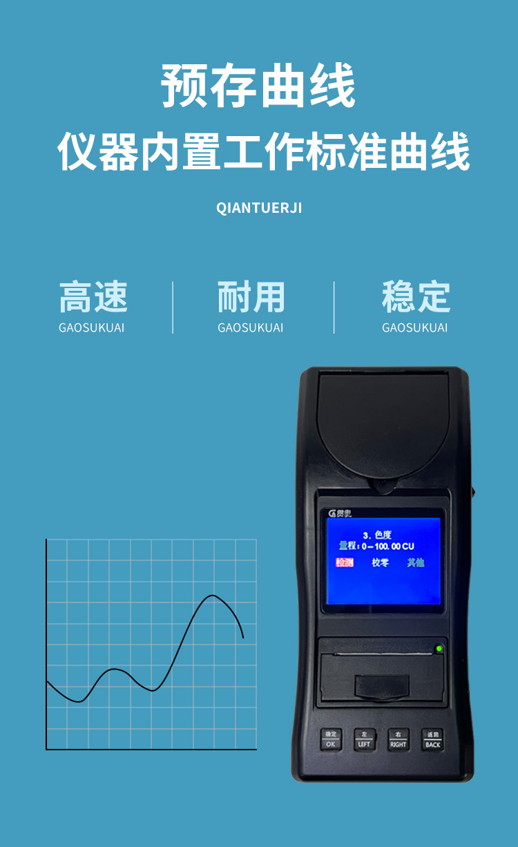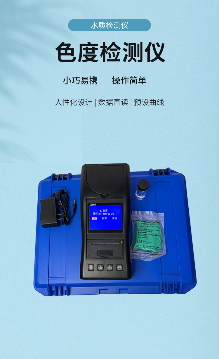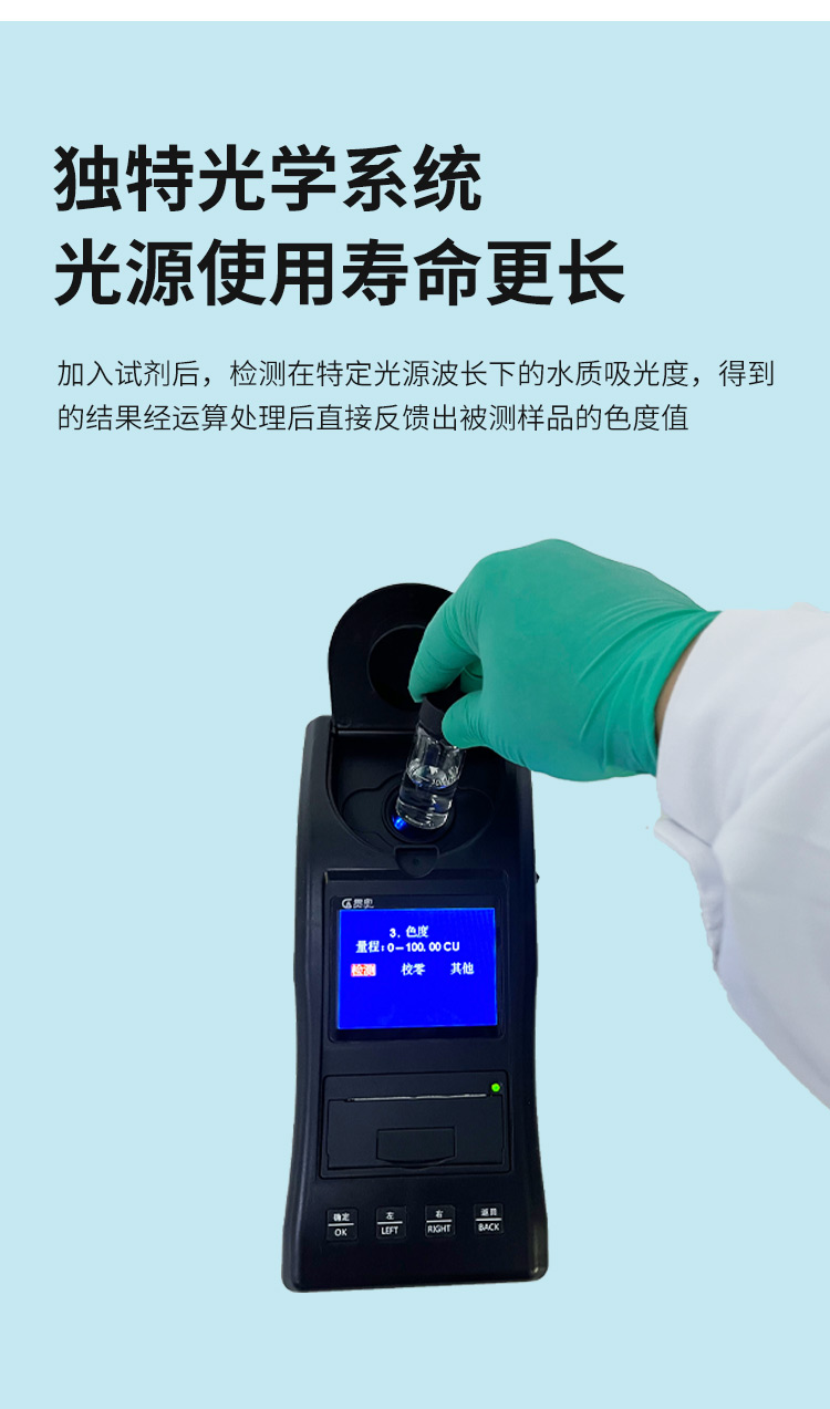 貫奧色度檢測儀可快速準(zhǔn)確測定地表水、地下水、城市污水及工業(yè)廢水中色度指標(biāo),濃度直讀;可廣泛用于水廠、食品、化工、冶金、環(huán)保及制藥行業(yè)等部門。儀器是由單個的固定波長固定用途的分光光度計糅合而成的,采用分光光度法原理對各參數(shù)進行測量,在儀器中建立不同參數(shù)的濃度顯色程度與吸光度的線性曲線,儀器通過對顏色的辨別,得出被測水樣的濃度。本儀器采用全中文菜單,操作簡易易懂,使用方便快速測量準(zhǔn)確度高。